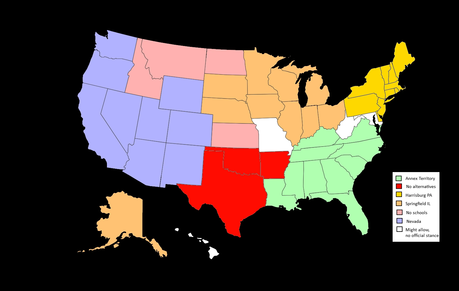 - Alabama laws still only allow Cronenberg Academies for girls, not for boys, so no Reformed Academies.